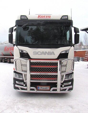 -Karjapuskurin alaputki jää melkein auton oman etupuskurin kanssa samalle tasolle.